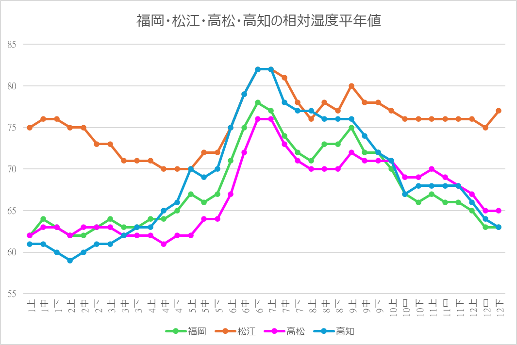 福岡管区気象台のデータを、直線距離としてはほぼ等距離の松江・高松・高知の3地方気象台のデータと比べてみました。日本海側代表が松江、瀬戸内代表が高松、太平洋岸代表が高知という布陣のつもりです。