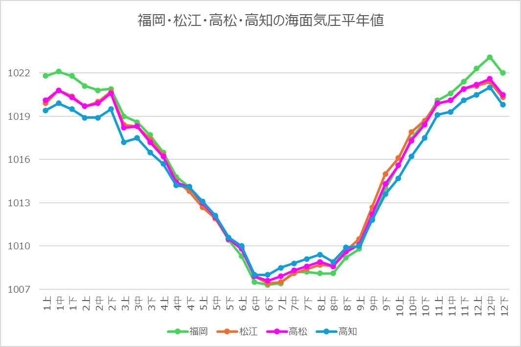 福岡の気圧は冬が高く、夏には4地点中もっとも低くなるようです。相関係数は高知と高松に対して「0.998」、松江に対して「0.995」です。