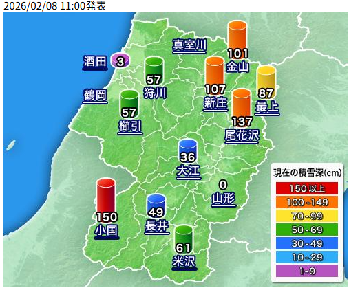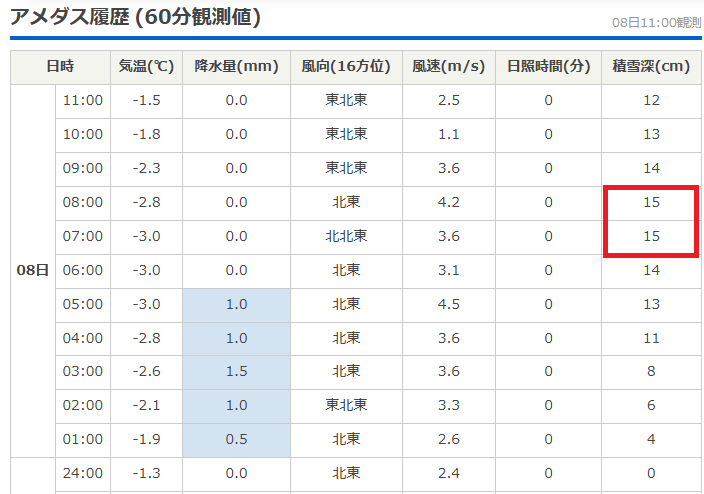 午前8時の積雪、宇都宮15センチで山形0センチ