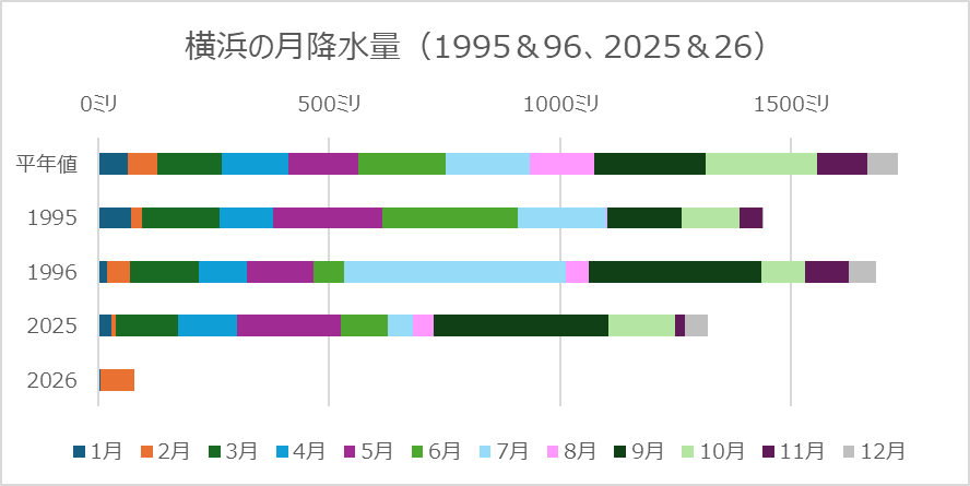 神奈川県では平成の大渇水から2年遅れの1996年2月に異常渇水対策本部が設置され、取水制限が実施されています。これは1995年8月の降水量が2ミリ、12月が1.5ミリだったためです。