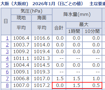 「日降水量≧1時間降水量≧10分降水量」であるはずですが、1月8日の大阪は10分降水量の最大値が0.5ミリ、1時間降水量の最大値が1.5ミリで、日降水量は0.0ミリだそうです。