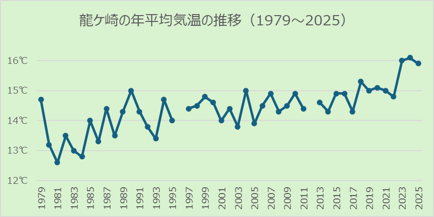 最高気温は2007年8月16日の38.5℃、最低気温は1984年1月20日のマイナス15.5℃、積雪観測は行われていませんが、積もっても10~15センチのレベルだと思われます。年平均気温は次のように推移しています。