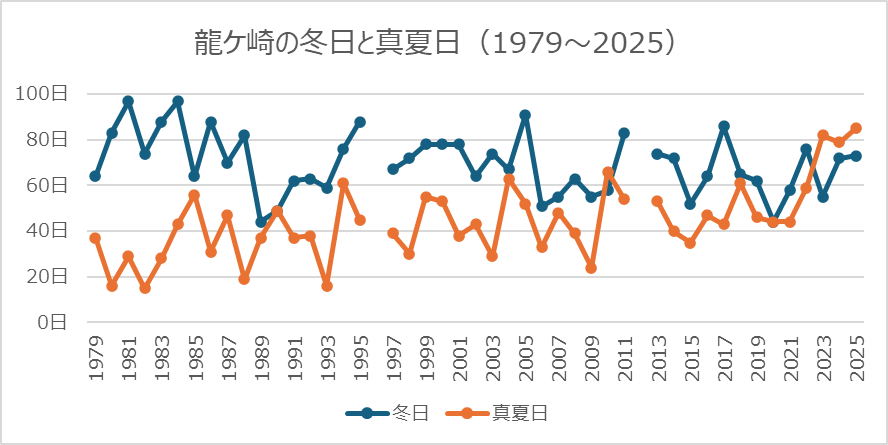 2023年以降は冬日より真夏日のほうが多くなっています。