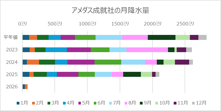 で、アメダス成就社の降水量です。今月は50ミリには届くのでしょうが、それでも平年値の半分に達するかどうかの世界です。去年6月から平年値未満を続けていて、先月までで8か月連続です。
