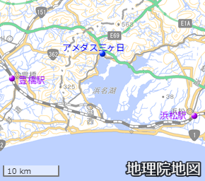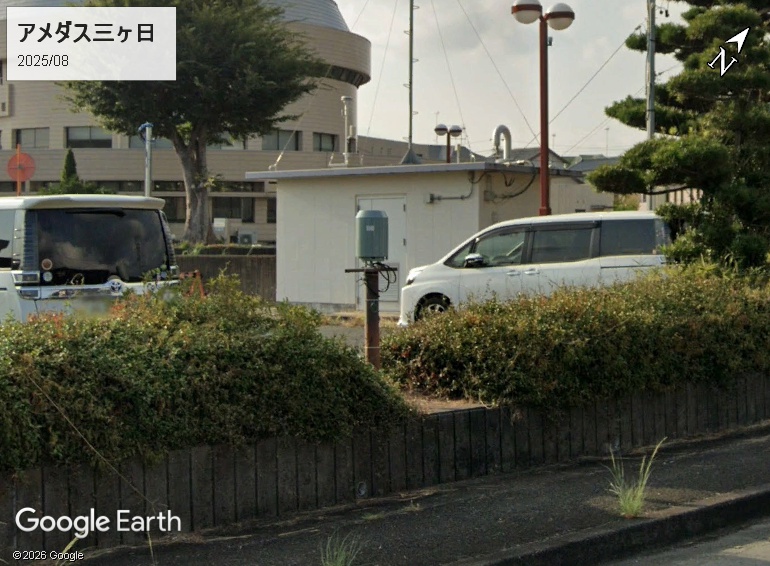 Googleマップで「アメダス三ヶ日」を検索すると、道路(歩道)上にピンが刺さります。