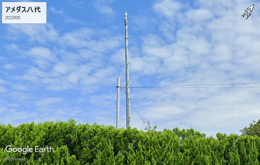 樹木に遮られて、ストビューでは風速計の頭しか見えません。標高は8mとされています。1979年11月に麦島と呼ばれる市役所南の球磨川中洲から移転しています。最高気温は2024年8月20日の38.7℃です。