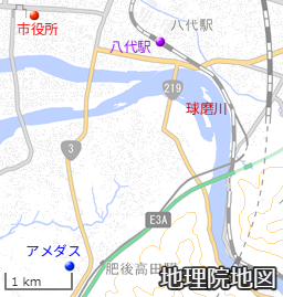 八代市役所は八代城の隣にあり、市役所の南東側が八代の中心市街地です。在来線の八代駅北側は製紙工場の敷地になっており、特有の臭気を感じることになります。アメダス八代は中心市街地から3キロ以上離れた熊本高専の敷地内にあるようです。