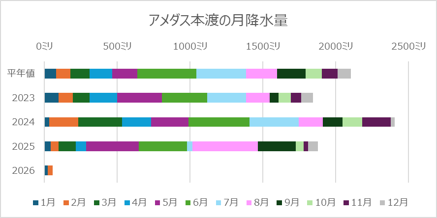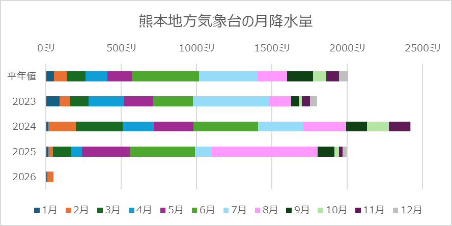 熊本は県全体としては渇水リスクが低いほうですが、この数か月の少雨傾向は太平洋側各地と同様です。0ミリではなかっただけで少なかったことに変わりはありません。