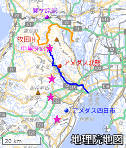 青線は員弁川(いなべ-がわ)で、三重用水地域では最長河川です。員弁川中流域にはアメダス北勢があります。アメダス北勢は1976年にアメダス阿下喜(あげき)として観測を始めて、2001年に移転し名称変更、翌2002年に現在地に移転しています。
