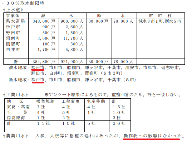 柏は無傷なのに一部とはいえ松戸では断水とは、どういうカラクリがあったのか気になるところです。30年前の話ですので、今も同じということはないはずです。稲作で水が必要な出穂期を過ぎていたため、30%制限でも農作物への影響はなかったようです。
