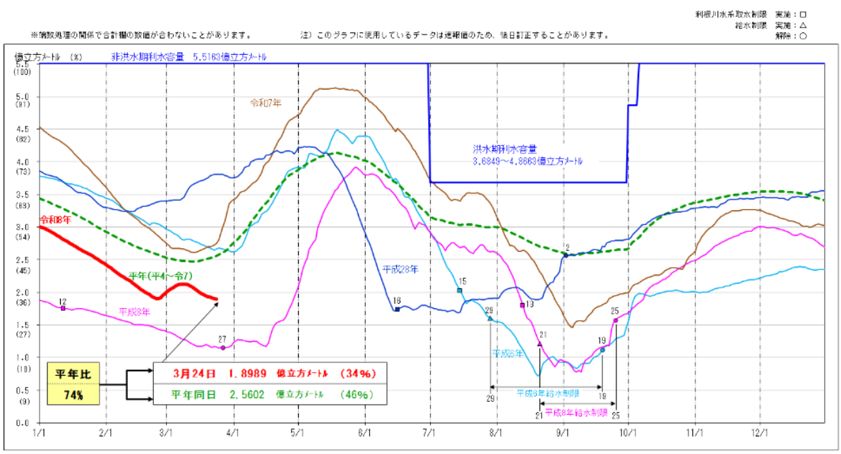 1月の1.5ミリを2月で取り戻したはずでしたが、3月は不振です。県内河川への依存度は低いため、渇水になるかどうかは上流域次第です。