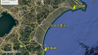 九十九里浜と茨城の百里九十九里浜はチーバくんの後頭部から背中です。北は旭市の刑部岬(ぎょうぶ-みさき)から南はいすみ市の太東岬(たいとう-みさき)まで海岸延長は約66キロとされています。源頼朝の時代の1里は6町です。1町は約109mですので...
