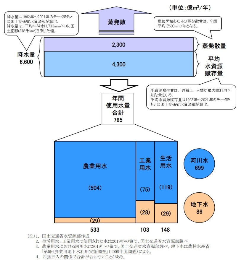 水の消費量の約3分の2は農業用水です。国交省のデータでは67.9%(533/785)になります。