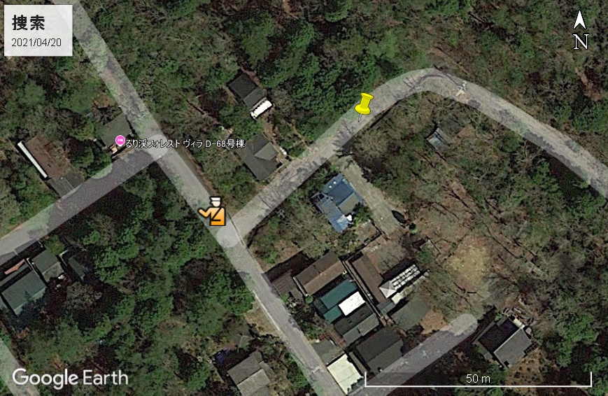 ストビュー画像では左下が規制線、中央の坂道が警察車両が出てきた道です。